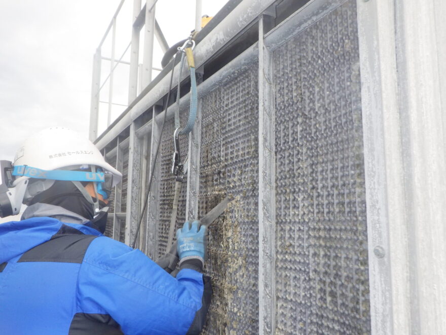 従来は「充填材交換」が前提とされることも少なくありませんでしたが、付着物の状態によっては、清掃によって能力回復が可能な場合があります。